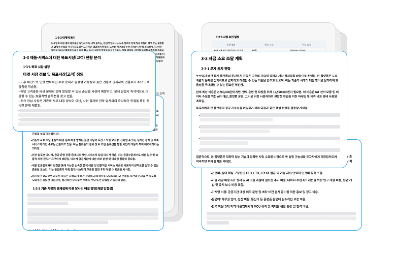 목적에 맞는 구조와 논리로 완성도 높은 사업계획서를 자동으로 만들어주고,